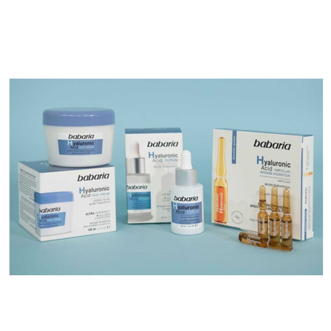 AMPOLLA ACI HYALURONICO CJA X 5 UND X 2 ML-31748, BABARIA SERUM ACIDO HIALURONICO X 30ML-31741, CREMA FACIAL ACIDO HIALURONICO X 50ML-31739